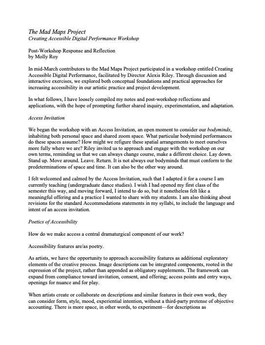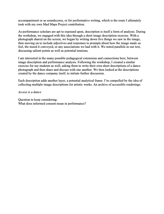 To conclude, we considered ways of incorporating audiovisual descriptions into our own work, not as a separate document or caption appended to a given piece but, rather, as a dramaturgical component integral to the overall meaning of a given piece. We think of this this creative approach as enacting a poetics of accessibility.